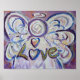 "Love" Inspirational Angel Word Painting - The word "Love" is painted in a soft white and pink pastels with purple in the background. The angel is framed with blue and purple accents. The word "Love" is in gold. The acrylic painting has a textural contrast and sparkle from a light layer of glitter.