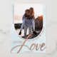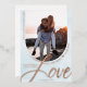 Arched frame photo save the date announcement with decorative rose gold foil "Love" and curved text. Soft pale blue with and plenty of room for a special message or additional photographs or information.