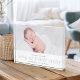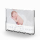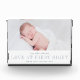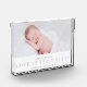 Simple and modern baby photo keepsake block features your favourite horizontal or landscape orientated newborn photo, with a white band along the bottom reading "love at first sight" in light grey, flanked by your little one's name and birth stats. A modern and minimal gender neutral design that makes a perfect gift for new parents.