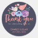 Vintage and rustic floral nest and love birds thank you sticker. Beautiful watercolor drawing of two birds and a bouquet of flowers. Thank you word in hand lettering script calligraphy font. Customise the wording for spring wedding favour, party favour label for bridal shower, baby shower, birthday party or any special occasion. Background colour can be customised to your desired colour theme.