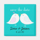 This Save the Date Magnet has a cute graphic of love birds facing each other and an aqua teal background. This can be customised with your text and a different coloured background by choosing the customise it button and edit.