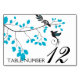 This table number card features two birds with blue accents and a tree branch with matching blue leaves.
