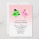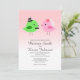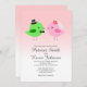 A cute and whimsical wedding invitation with a pink to white gradient background, featuring two love birds getting married.