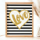 Beautiful modern trendy typography brush script quote. "Love". Featuring a pretty gold metallic heart glitter frame and gold letters with black and white stripes.