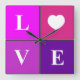 LOVE ~ Bright and cheery, Square wall clock. Simple design pinks and purples.
