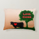 Moo! This throw pillow features the black silhouette of a cow with a red heart in it. The cow stands in a field with a lone, green tree with the two-word phrase "Love Cows" over the tree. The abstract background features an orange and white gradient with horizontal lines. The words are designed to be changed, so you can replace them with your own name or short message! A great decorative item for farmers or lovers of livestock!