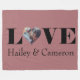 This custom blanket features a cute and wholesome design. The word LOVE is printed in a large black font across a blush rose background. The "O" in love is replaced with a heart shaped photo frame. The names of the couple are printed below. It's perfect for Valentine's day, a birthday, anniversary, or other special occasion.