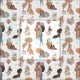 Cute illustration of girls and dogs of various breeds on a beige background