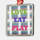 Green, Purple, and Red: These vibrant colours are used for the words "Love," "Eat," and "Play," respectively, providing strong visual contrast against the lighter background and adding a playful touch.