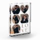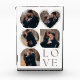 The Photo Block design features a stylish arrangement of five customisable photo cutouts in unique shapes: two circular, one heart, one arch, and one square. Below the photos, the word "LOVE" is elegantly spelled out in a soft, neutral-toned font, adding a warm and sentimental touch. Perfect for decorating your home or gifting someone special.