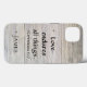 Love Endures All Things, with name or monogram ready to update. A timeless quote from the bible about the endurance of love is paired with a distressed wooden design based on photo of a real wooden table. The table in the image lasted through years of weather and use, and has the cracks and faded grey colour as a result. A fitting metaphor for the lasting nature of love. Quote from First Corinthians. Wood design looks cool and wraps around the sides of the case in this layout.