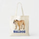 Bulldog Love! This fun canine tote features an image of a chubby tan and white English Bulldog puppy dog with the word Bulldog printed in a cute blue heart font.
