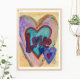 Painting of the word "Love" in cherry red with a royal blue colour outline. Love is framed by overlapping red, blue, purple, and pink hearts on a golden background. A light layer of glitter gives glow and contrast to the Love artwork. This love art painting is a tribute to the many layers of love within a family. You can personalise this love art poster print with the "Customise" button. Add your own text and images for a personalised love gift!