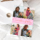 Modern and elegant Valentine's Day photo template card featuring 4 pictures with a hand written script text that says "Love makes a family" with hearts. You can add another picture and a message on the back of the card. Orange pink.