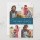 Modern and elegant Valentine's Day photo template card featuring 4 pictures with a hand written script text that says "Love makes a family" with hearts. You can add another picture and a message on the back of the card. Teal.
