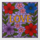 Around the central word is a symmetrical arrangement of normal flowers. There are red flowers with layered petals and subtle shading, blue with soft gradients and natural petal veining, purple and lavender blossoms that blend with the background and small pink accent flowers adding softness and balance.