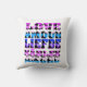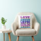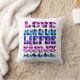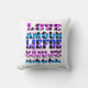 Are you looking for a loved theme pillow? This throw pillow says love in English, French, Dutch, Swedish and Italian. Inside the words is a heart pattern in various shades of pink, purple, and blue.