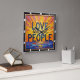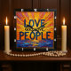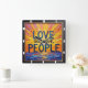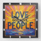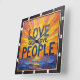 This image showcases a vibrant and inspiring artwork. The artwork features the text "LOVE GOD, LOVE PEOPLE" in bold, colourful letters against a dynamic background. The top half of the background radiates with warm hues of yellow, orange, and red, resembling a sunburst, while the bottom half transitions into cooler tones of blue and purple, evoking a sense of water or sky. The use of bright colours and dynamic brush strokes creates an uplifting and motivational visual effect.