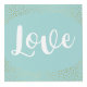 Photo cube with room for four of your wedding photos, with love written on a robin's egg blue background decorated with faux gold confetti.