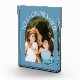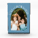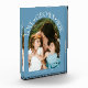 Modern and minimal family memory photo block featuring a photo in a arch frame with a text that says "Love Grows Here" with tiny hearts. Denim blue.