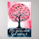 A watercolor illustration of a tree with hearts as leaves. The hearts are in various shades of pink and red. At the bottom, there's a white text that says "Love Grows When God Waters It."