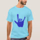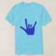 Sign language hand symbol for I love you, in blue, printed on tshirts.