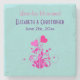 Wedding commemorative coaster. Wording / text says: Love has blossomed with customised (Names) (date). The background is a icy blue colour. An illustration of a blossoming heart plant with pink hearts and decorative swirls and curls all around.