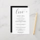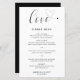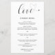 Cute wedding menu featuring a simple and minimal design with the word "love" in an elegant typography with a heart at the end. Below is your menu in a modern sans serif along with your names and date. These cheap wedding menus with a minimalist style are printed on sheets of paper for a budget friendly option.