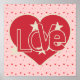A cute and romantic illustration just in time for Valentine's Day or throughout the year to express your whimsical style. Retro sixties design. A big red heart with the word Love written in a fun and cheerful font. A group of stars surround the text. The background is made up of more hearts coloured white, red and pink on a pale pink backdrop.