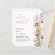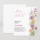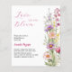 A chic white background. Decorated with a wildflowers in pink, purple, yellow. Personalise and add the name of the bride to be and party details. Text: Love is in bloom.
