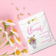 Love is in bloom! Vibrant floral wedding collection featuring a bouquet in a marble vase surrounded by butterflies, and accompanied by fuchsia script typography.