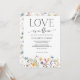 Celebrate the bride-to-be with this romantic “Love Is In Bloom” summer bridal shower invitation featuring a wbite background, elegant black modern calligraphy, and vibrant watercolor wildflowers in blue, yellow, blush pink, purple, and cream. Delicate butterflies flutter along the bottom for a whimsical touch. Perfect for garden, boho, rustic, or floral-themed bridal showers in spring or summer. Easily customize the text to suit your event details.