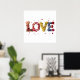 Colourful flowers arranged to spell out the word "LOVE" create a vibrant and eye-catching design. The dark background contrasts with the vivid colours of the flowers, highlighting their beauty and form.