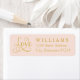 Wedding return address labels feature "Love" in an elegant gold coloured calligraphy script and a pretty blush pink background colour that can be customised for any wedding colour scheme.