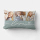 Modern and stylish custom lumbar throw pillow design features a photo collage of three (3) favourite photos with a simple and minimal white "Love" typography design that includes flourish and heart details. The neutral grey mist green and white colours can be modified.