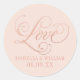Round wedding favour stickers feature "Love" in rose gold coloured script with a custom monogram design that includes the bride and groom's name and wedding date. The blush pink background colour can be customised.