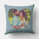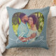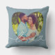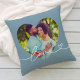 Modern and stylish custom throw pillow design features a favourite photo in a big heart shape with a minimal white "Love" typography overlay design that includes flourish and heart details. The slate grey-ish green blue background colour can be modified. A unique gift idea for a newlywed couple or for your loved one on Valentine's Day!