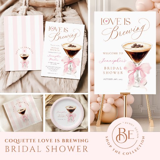 Elegant bridal shower napkins with a coffee theme, featuring a sweet pink bow and heart detail. Perfect for a love is brewing party, espresso martini bridal shower, or a modern brunch celebration. A chic touch to your table with watercolor style and elegant calligraphy.