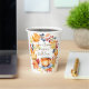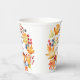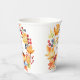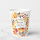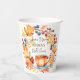 Love is brewing fall themed bridal shower tableware personalised paper cups, watercolor fall leaves and berries wreath and pumpkin cup of tea for autumn themed tea party bridal shower paper cups.