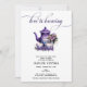 A beautiful, elegant gothic tea party theme bridal or couple shower invitation featuring an illustration of a tea set, in a monochrome purple colour palette. The motto of the event is "Love is brewing."