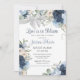 Love in bloom blue floral and bow bridal shower invitation with complimenting bouquet on reverse side of printed card. Completely printed invitation, the ribbon is printed and not a real element. Personalise text and fonts as preferred.