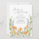 Celebrate your special day with these watercolor floral invitations, featuring delicate wildflowers in shades of orange and lavender, beautifully accented with botanical sage green leaves. The elegant calligraphy script reads "Love is in Bloom," making these boho chic wedding invitations perfect for a floral brunch, bridal shower dinner, or botanical bridal shower.