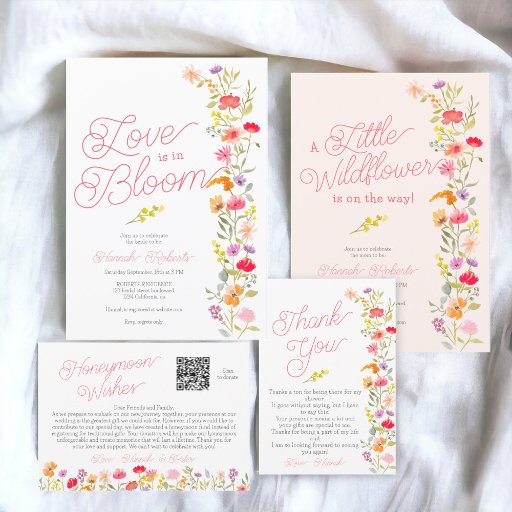 Love is in bloom wildflowers floral bridal shower featuring pretty hand painted vibrant and bright orange, pink and yellow flowers watercolor illustration with a modern elegant script font saying Love is in bloom, with bohemian greenery foliage on beige ivory. Perfect for Spring, summer outdoors garden bridal or wedding party.