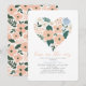 This elegant "love is in the air" valentine's day bridal shower invitation features a heart made with flowers in pink, white, and blue. The reverse side features a light pink background with pink floral patterns. Personalise it for your needs. You can find matching products at my store.