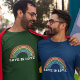 Bright rainbow symbolising gay pride with the inclusive text Love Is Love. Shirt is unisex and graphic may be transferred to other shirt styles or other products.