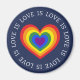 LGBTQ pride rainbow heart is surrounded by the words "LOVE IS LOVE IS LOVE" repeating around it in white text on a navy blue background. The heart is made of red, orange, yellow, green, blue, and violet concentric hearts. Great swag for Pride!