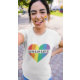 A colourful t-shirt featuring a big heart with the colours of the LGBTQ rainbow flag, with the customisable caption "Love is love" in a black all-caps font. Wear this gay pride awareness T-shirt to show the world that you are a proud LGBTQ community member.