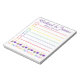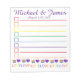 List-style grocery shopping note pad design features an original marker illustration of a rainbow wedding cake slice and a purple heart, with LOVE in a pretty rainbow font. Just personalise with your wedding information for a unique favour.