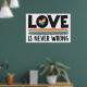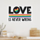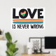 LGBTQ pride month poster featuring the caption "love is never wrong" in black all caps fonts decorated with a little rainbow heart and a colorful stripe on a white background.