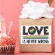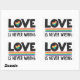 LGBTQ pride month stickers featuring the caption "love is never wrong" in black all caps fonts decorated with a little rainbow heart and a colourful stripe on a white background.